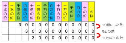 4年生の算数の学習です。ある数を10倍にした時、10分の1にした時、どのようになるのかを調べました。そして、10倍にすると1けた大きくなり、10分の1にすると1けた小さくなることに気づきました。