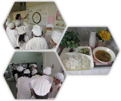 本日の給食の献立をご紹介します。本日の献立は、ご飯、たこのやわらか煮、みそ汁、野菜炒め、牛乳でした。