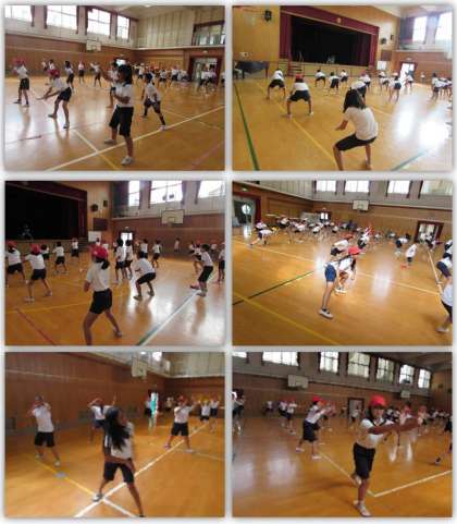 5年生の体育の学習の様子です。5年生の運動会での団体演技は、『南中ソーラン』です。力強い動きで表現します。