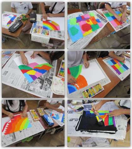 4年生の図画工作の学習です。パスで塗り込んだ画用紙の上から黒インクを塗り、乾いたらわりばしペンで削っていきます。