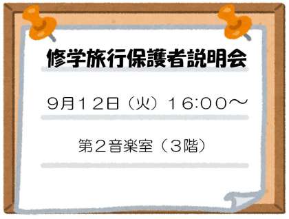 修学旅行保護者説明会のお知らせ 公開日 2017/09/08 更新日 2017/09/08 6年生 9月12日(火)、午後4時より第2音楽室で、修学旅行保護者説明会を行います。よろしくお願いします。 いいね(0)