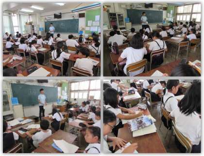 5年生の総合学習の様子です。南中ソーランで着る法被の背中に、各自、一文字書きます。子どもたちは、自分の名前の一字を取ったり、好きな文字を選んだりしていました。