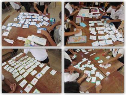 9月13日(水) 1年生の国語の学習です。自分で作ったかるたを並べています。