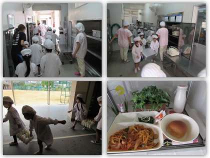 本日の給食の献立をご紹介します。本日の献立は、黒糖パン(小)、牛乳、イタリアンスパゲッティ、グリーンアスパラガスのサラダでした。