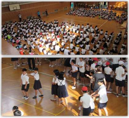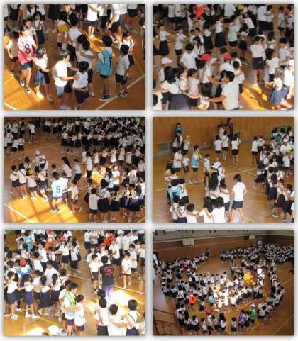 木曜日の朝、児童集会の様子をご紹介します。今日の集会は『じゃんけん列車』をしました。じゃんけんをして、負けたら相手の後ろにつきます。じゃんけんの回数を重ねるうちに、列がどんどん長くなっていきました。