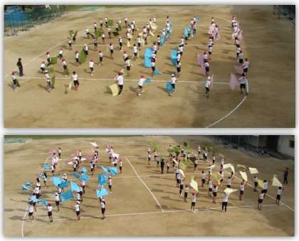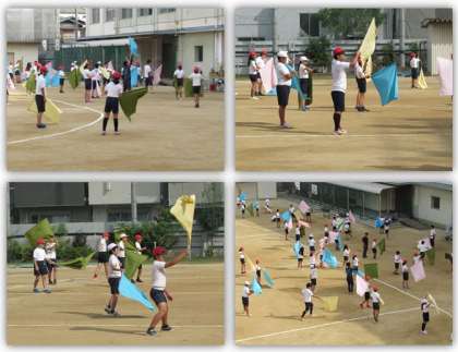 6年生の体育の学習です。運動会に向けて、団体演技(フラッグパフォーマンス)の練習に取り組んでいます。