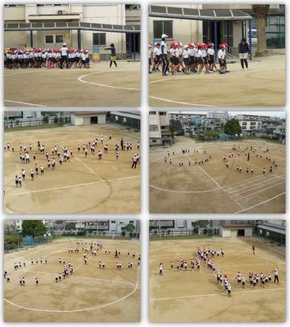 2年生の体育の学習です。運動会に向けて、ダンスの練習に取り組んでいます。今日は運動場で、隊形移動の練習を行いました。
