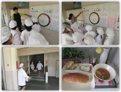 本日の給食の献立をご紹介します。本日の献立は、レーズンパン、牛乳、揚げ餃子、鶏肉と冬瓜の中華煮、梨(豊水)でした。