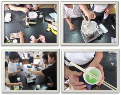 科学クラブでは、カラーろうそくを作りました。ろうそくを削って溶かし、カップにパスを削ったものと一緒に入れて、それぞれきれいなろうそくを作りました。