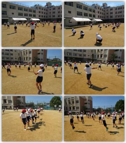 4年生の体育の学習です。運動場で団体演技の練習を行っています。