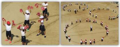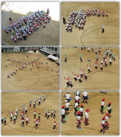 2年生の体育の学習です。運動会に向けて、団体演技の練習に取り組んでいます。