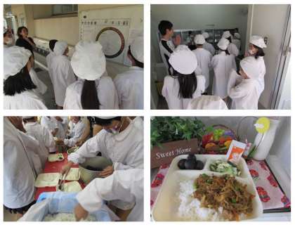 本日の給食の献立をご紹介します。本日の献立は、ドライカレー、グリーンサラダ、ぶどう(巨峰)、ご飯、牛乳でした。