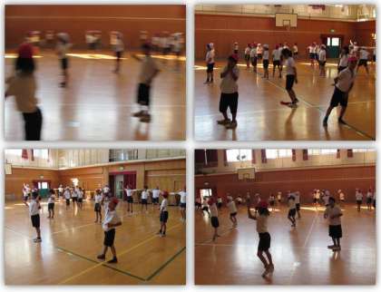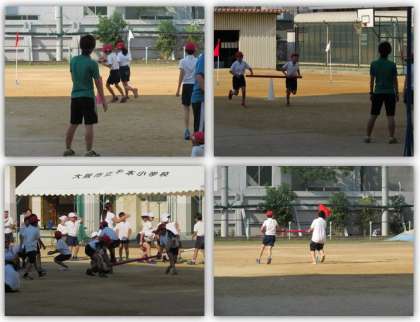 3年生の体育の学習です。体育館で団体演技(ダンス)の練習に、運動場で徒競走、団体競技(台風の目)の練習に取り組みました。