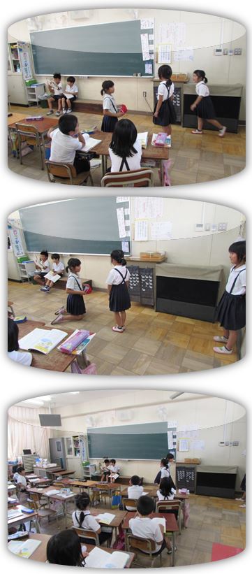 2年生の国語『名前を見てちょうだい』の学習です。班ごとに場面を選び、人物の様子を想像して声や動きで表して発表しています。帽子が飛んでいく場面では、見ている子どもたちから「わあ」と声があがりました。