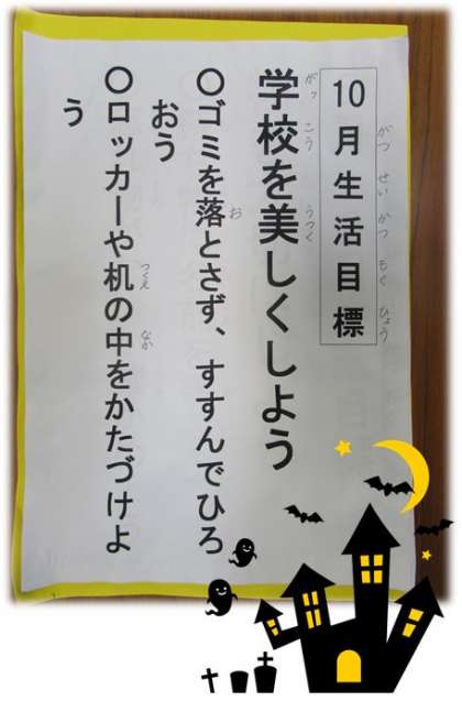 10月の生活目標です。10月は『学校を美しくしよう』です。具体目標は、