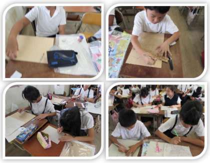 5年生の図画工作の学習です。パズル作りで、板に絵を描いています。