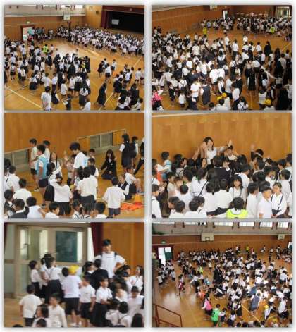 本日の集会は、集会委員会による『指令ゲーム』でした。「集会委員の指令です。○○してください」と言えば、その通りに、「集会委員の〜」と言わなかったり、他の委員会の名前での指令で動くとアウト、というゲームです。子どもたちは、ペアで好きなものを言い合ったり、近くの先生にタッチしたりしました。