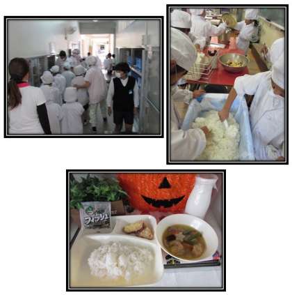 本日の給食の献立をご紹介します。本日の献立は、ご飯、豚肉と一口がんもの煮物、さつまいもの天ぷら、ミニフィッシュ、牛乳でした。