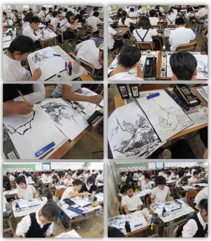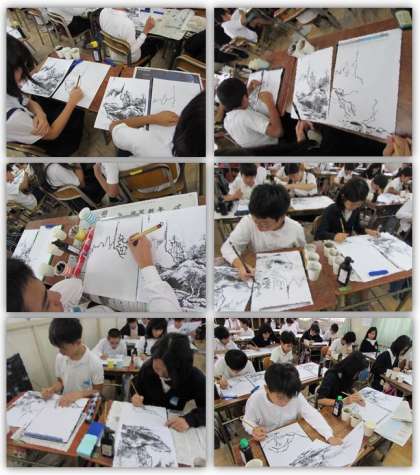 6年生の図画工作の学習です。雪舟の作品『秋冬山水図』の模写に挑みました。模写してみると、墨だけで濃淡を表現することの難しさや面白さがわかってきて、子どもたちは集中して取り組んでいました。