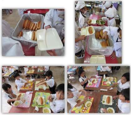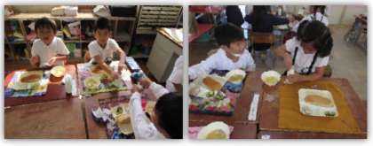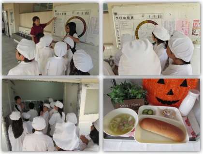 10月は、食物アレルギー対応サポート月間です。『コーンクリームシチュー』は、小麦粉の代わりに上新粉(米粉)を使って、とろみをつけています。また、『ポークカレーライス』は、米粉で作ったカレールウのもとを使っています。