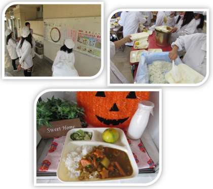 本日の給食の献立をご紹介します。本日の献立は、ポークカレーライス、グリーンサラダ、みかん、牛乳でした。