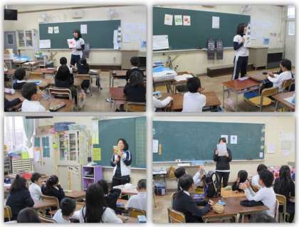 各学級では、英語のカードを使ったり、絵本の読み聞かせをしたりしています。