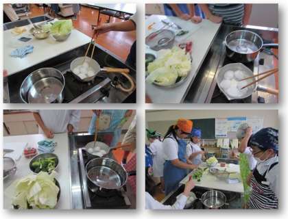 5年生の家庭科の学習です。家庭科室に行き、調理実習を行いました。今回は、野菜を茹で、卵を茹でる調理です。班で協力して、安全に取り組むことができました。