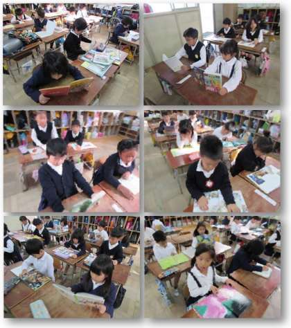 画像は、1年生の様子です。各自が本を1冊選び、集中して本を読んでいます。