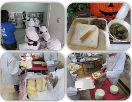 本日の給食の献立をご紹介します。本日の献立は、食パン、はちみつ、豚肉と野菜のケチャップソース、スープ、スイートポテト、牛乳でした。