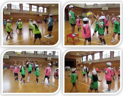 4年生の体育です。8チームに分かれ、ポートボールの試合をしました。