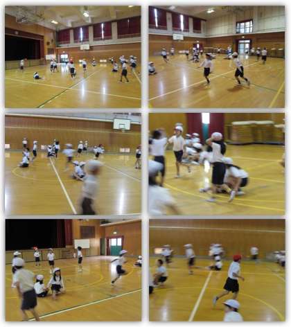 2年生の体育です。体育館で、『ガッチャンおにごっこ』をしています。