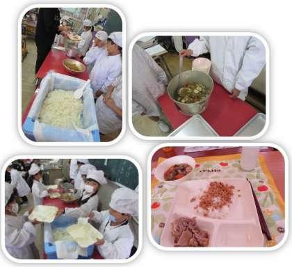 「ふきよせ」は、秋から冬の初めにかけて、献立に使われる名前です。『風に吹き寄せられた落ち葉を思わせるように、秋の味覚を盛りあわせた料理』のことで、秋が旬の栗、ぎんなん、いも、野菜、キノコなどが使われます。本日の給食では、里芋、レンコン、しめじを使いました。