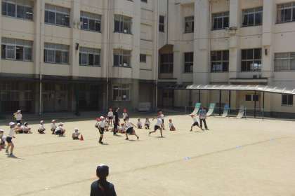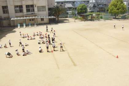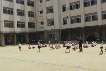 やわらかい黄色のボールを使って、取り組みました。ボールをしっかりと握ること、投げる前にボールを自分の後頭部にトントン、と当ててから(肘を上げることを意識させるためです)投げることなどを指導を受けて、子どもたちはボールを投げました。投げるうちに、高く、遠くまで投げられる子が増えました。8日の体力テストでどのような結果が出せるか、楽しみです。
