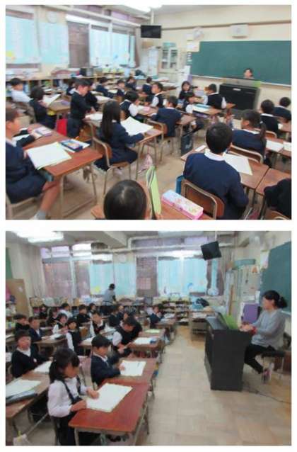 1年生の音楽の学習です。先生の弾くオルガンに合わせて、『しろくまのジェンカ』を歌っています。