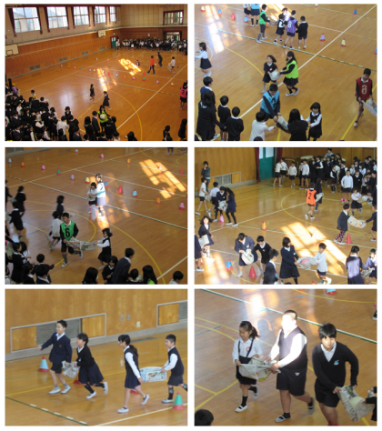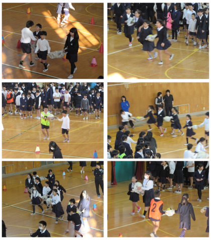 本日の児童集会は、集会委員会による『新聞リレー』です。ペアで新聞紙の端を持ち、その上にボールを乗せて運びます。班で何周できるか、競いました。