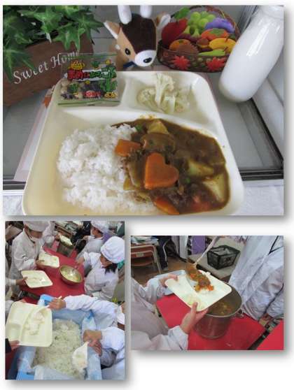本日の給食の献立をご紹介します。本日の献立は、ビーフカレーライス、カリフラワーのサラダ、まめこんぶ、牛乳でした。