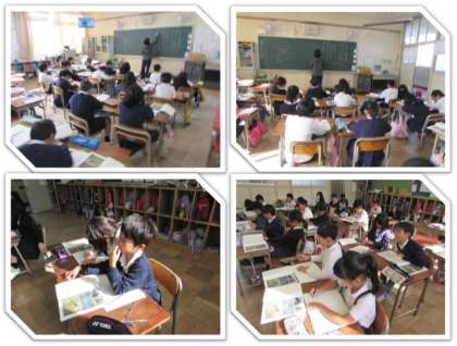 2年生の国語の学習です。『ビーバーの大工事』を読み、動物の秘密について調べて、クイズを作るという学習課題を確かめました。