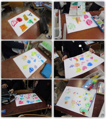 3年生の図画工作の学習です。絵の具を使い、水の量を多くしてにじみの効果を楽しみました。