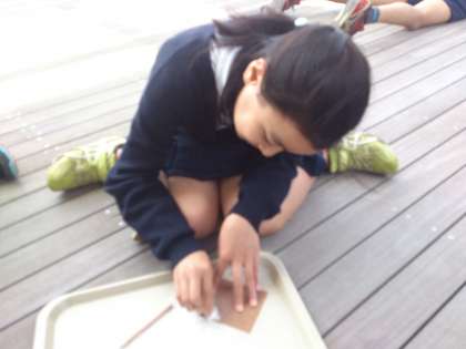 弥生学習館では、勾玉作りに取り組みました。思ったように削っていくのはけっこう難しかったです。出来上がった勾玉は水をつけてこするとピカッと光りました。
