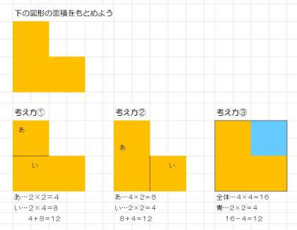 4年生の算数の学習です。既習の長方形や正方形の面積を求める学習を活用して、長方形を組み合わせた図形の面積の求め方を考えました。
