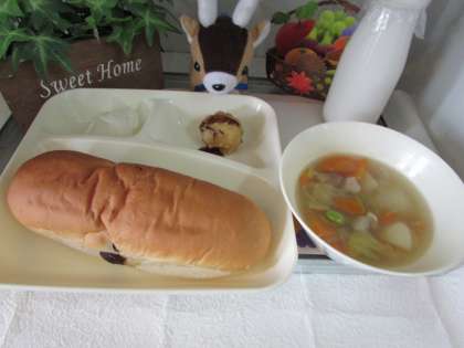 本日の給食の献立をご紹介します。本日の献立は、レーズンパン、牛乳、たこボール、洋風煮、だいこんのピクルスでした。