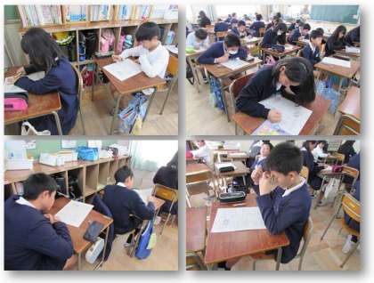 6年生の社会科の学習です。『世界に歩み出した日本』のテストに取り組んでいます。日清・日露戦争、条約改正、科学の発展やそれらにかかわる人物の働き等が問われています。