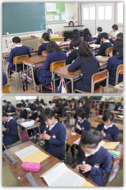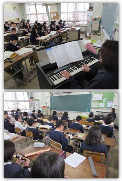 5年生の音楽の学習です。学習発表会に向け、リコーダーの演奏に取り組んでいます。画像は、先生のオルガン伴奏に合わせて『365日の紙飛行機』を吹いている場面です。