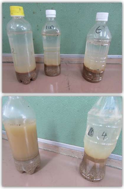6年生の理科の学習です。運動場の土をペットボトルに入れ、そこに水を注いで強く振りました。水のはたらきで地層ができることを確かめる学習です。