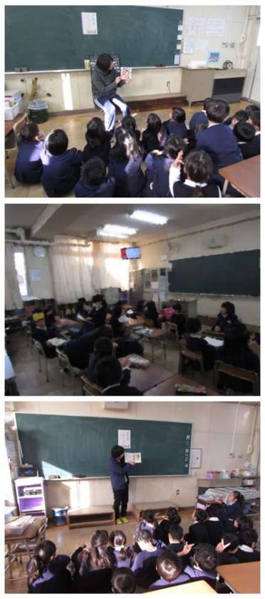 画像は、2年生の様子です。2年生では、英語の教材DVD『DREAM』を使ったり、先生が英語の本の読み聞かせを行ったりしています。