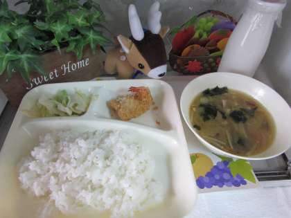 本日の給食の献立をご紹介します。本日の献立は、ご飯、えびフライ、豚汁、キャベツのかつお梅風味、牛乳でした。