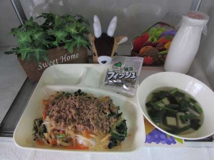 本日の給食の献立をご紹介します。本日の献立は、ビビンバ、わかめスープ、ミニフィッシュ、牛乳でした。
