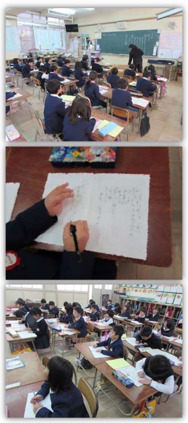 1年生が連絡帳を書いています。明日は学習発表会なので、そのお知らせも書いています。ずいぶん多くありますが、しっかりと書くことができています。