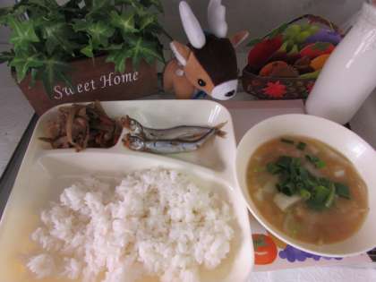 本日の給食の献立をご紹介します。本日の献立は、ご飯、焼きシシャモ、みそ汁、きんぴらごぼう、牛乳でした。