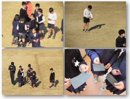 3年生の理科の学習です。虫めがねを用いて光を集め、明るさや、紙が焦げるかどうかを調べました。虫めがねで集めた光で、紙が焦げるのを見て、太陽の光のエネルギーに気づきました。